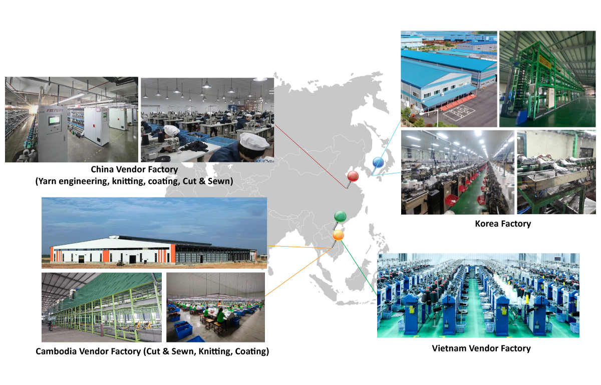 - Holds special manufacturing technology through R & D with excellent production partners in Asia including South Korea, China, Cambodia, Vietnam etc.
