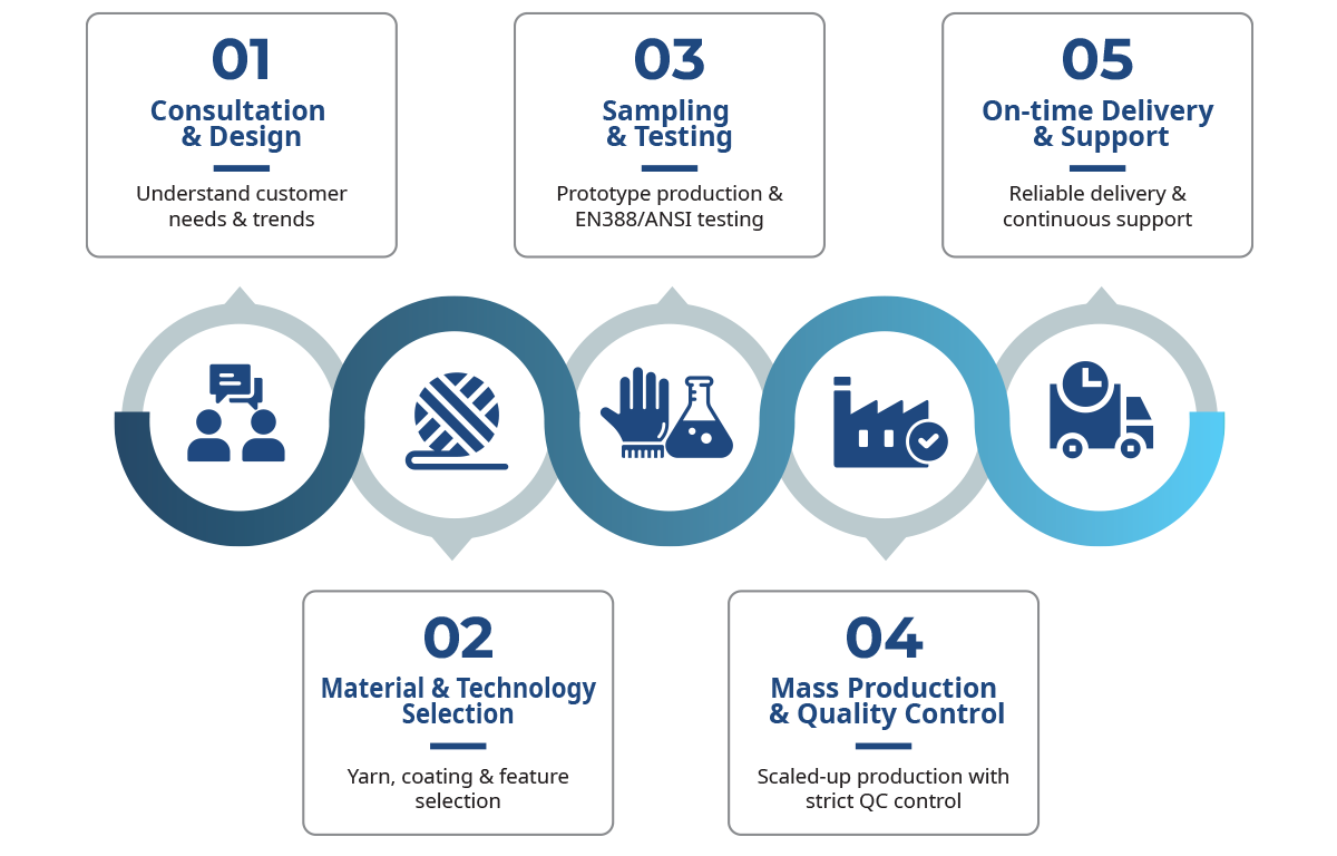 From OEM to ODM, we help brands and distributors around the world grow their business with high-performance, dependable gloves — backed by fast delivery and a flexible supply system.